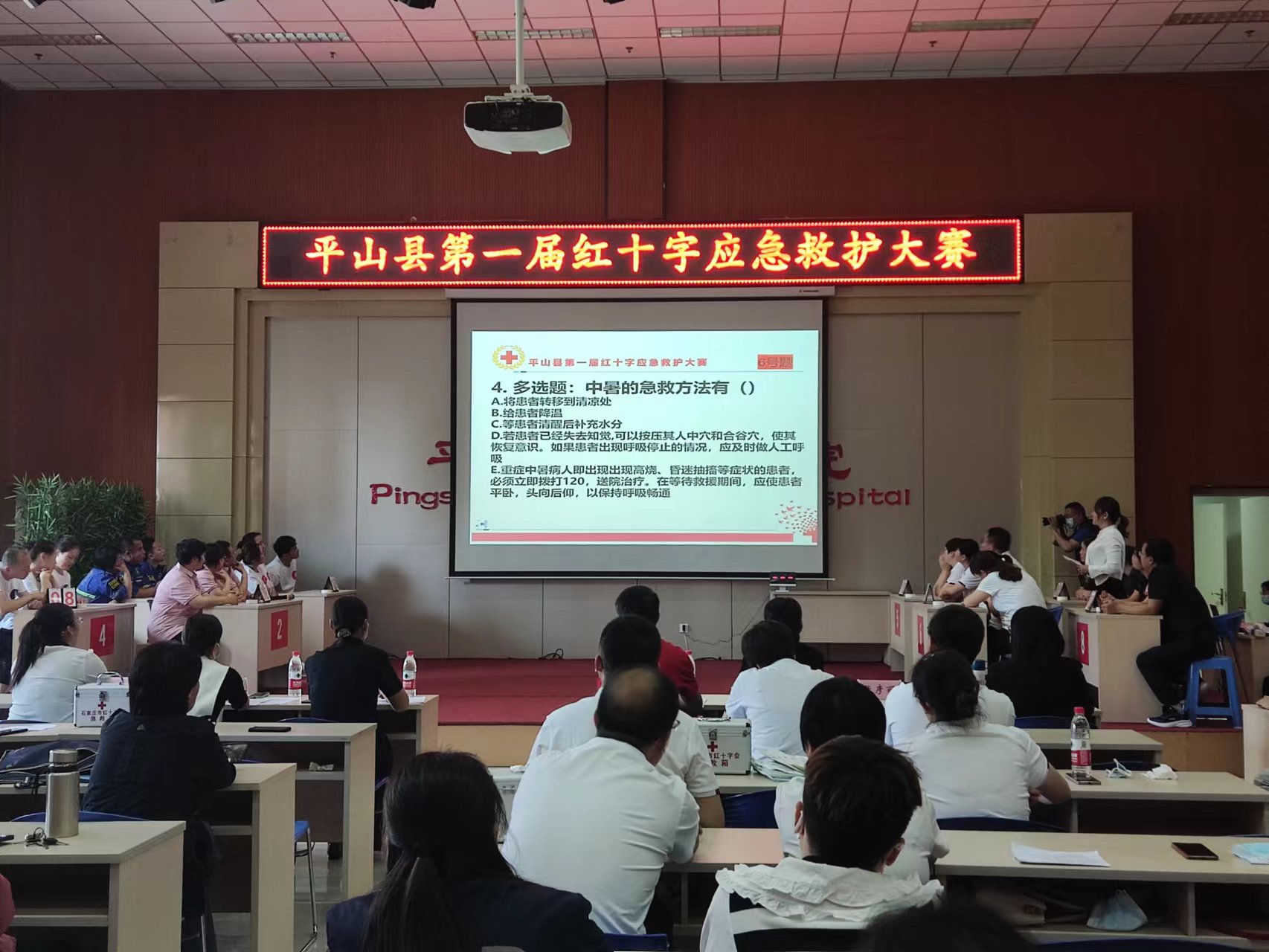 本次大赛共有8支队伍56名队员参赛,主要内容为理论知识问答、红十字救护演讲、应急救护现场实操3部分,充分展示了平山县红十字应急救护水平和团队风采,现场检验应急救护实际应用能力,对推动公众应急救护知识技能,普及人人学急救、急救为人人的健康理念,促进救护培训工作队伍的交流学习,以赛促训、共同提高具有重要意义。