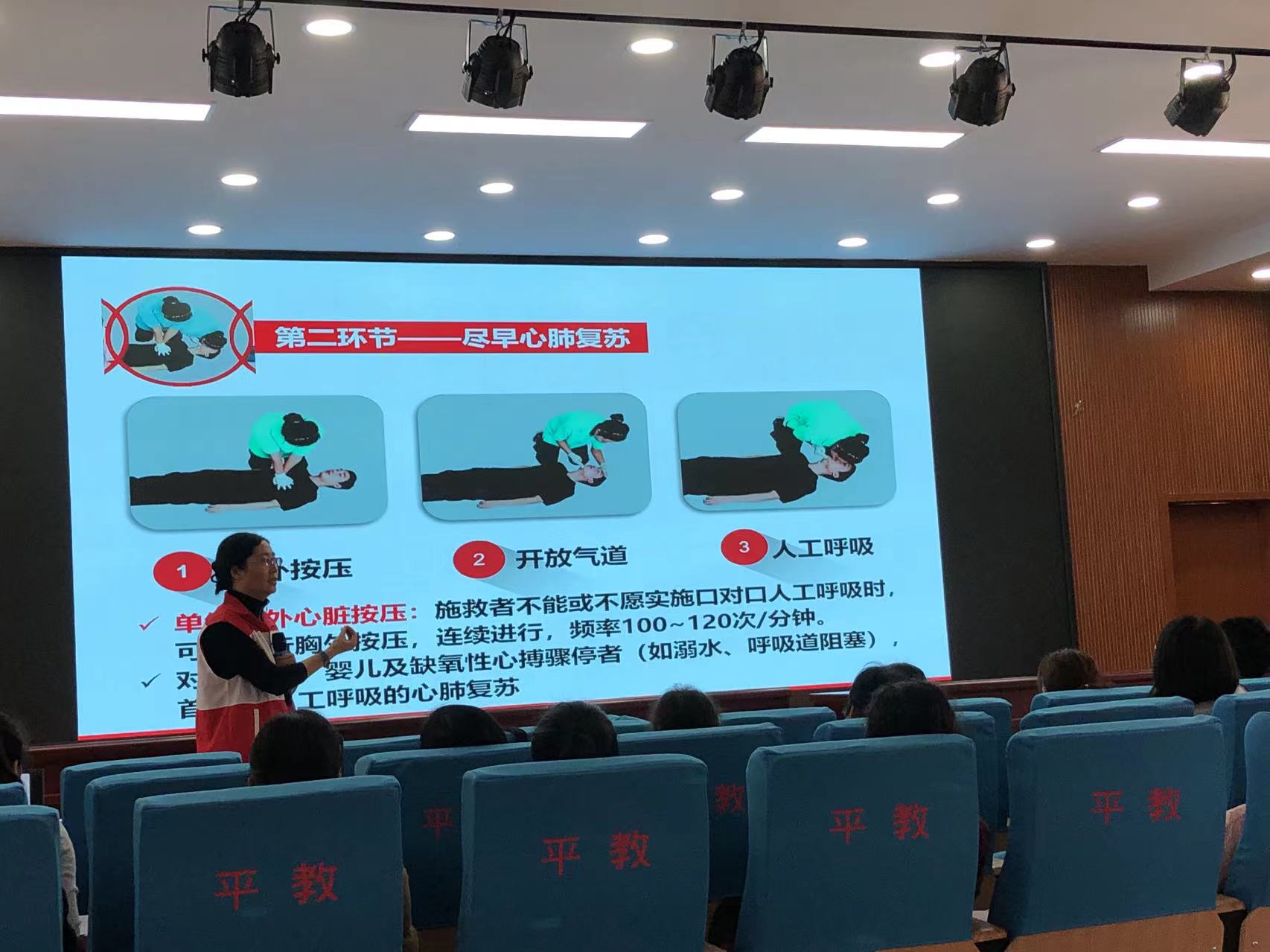县红十字会常务副会长任艳丽就本次应急救护培训进校园活动的意义和红十字运动历史讲授了开班第一课。在培训中,县红十字会聘请红十字应急救护师资向参训教师生动细致地讲授了心肺复苏、AED操作、创伤救护、气道异物梗阻救护、溺水和烧烫伤救护等应急救护理论知识和实操技能。参训教师们认真听讲,踊跃参与实操,课堂学习氛围浓厚。培训结束后,平山县红十字会培训中心为所有考核合格人员颁发了《红十字救护员证》。