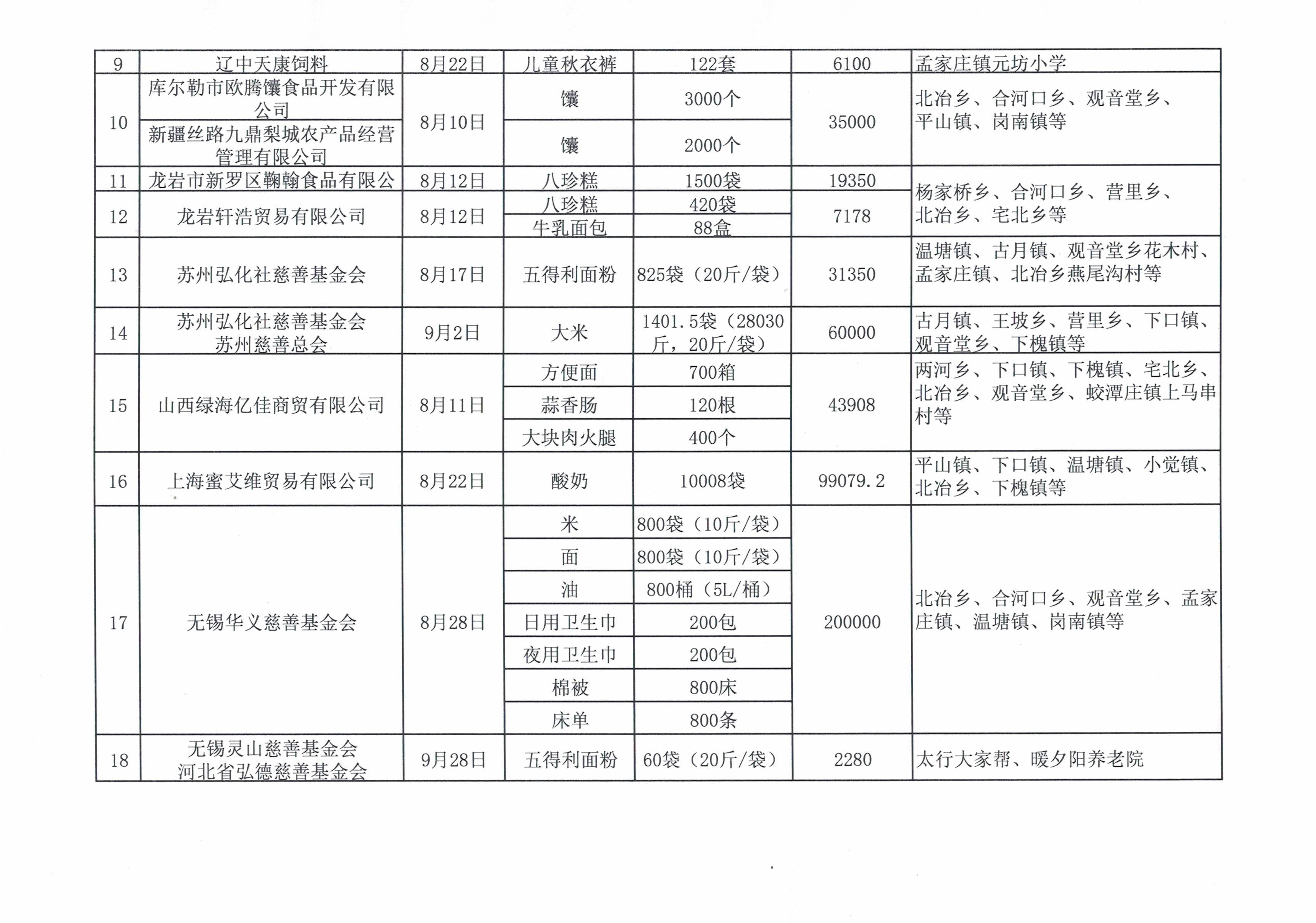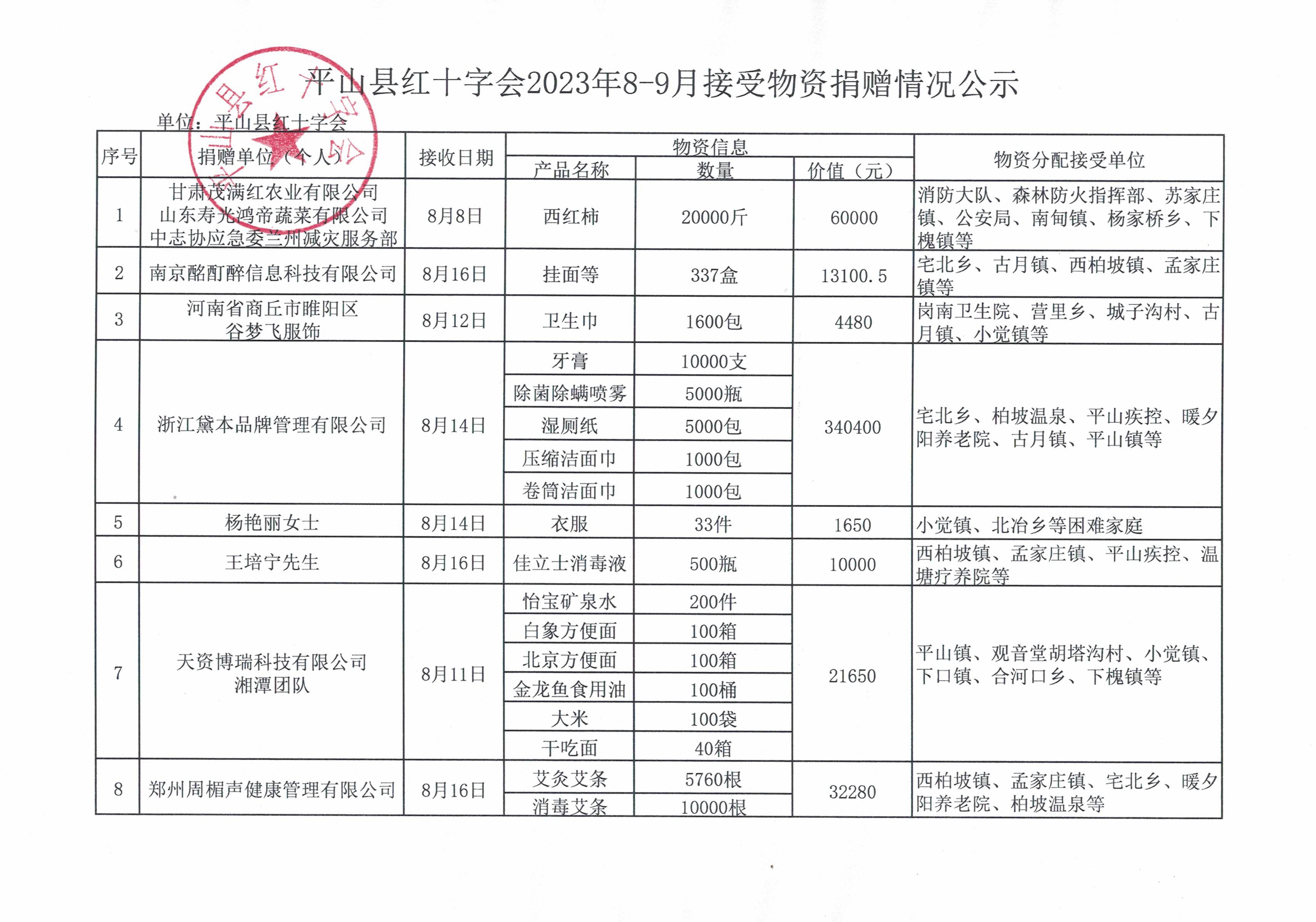 平山县红十字会2023年8-9月接受物资捐赠情况公示